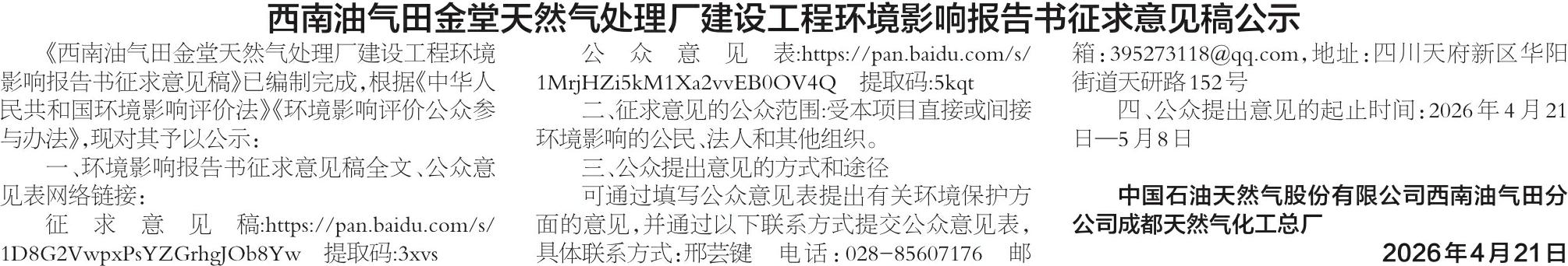 • 西南油气田金堂天然气处理厂建设工程环境影响报告书征求意见稿公示