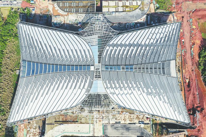 再看双层屋顶——上层是羽毛状铝板穿插光伏板,下层是铝镁锰屋面。南北高差8米,东西落差16米。两层间隔1.5米,“风揭”风险由此而生。为此,项目团队专门做了风洞实验,把夹板从6毫米加厚到8毫米;防水节点全部采用焊接代替胶缝,杜绝渗漏,“风揭”风险解除。安装“羽毛”时,施工人员支起了28900个支撑架,让曲面、高低各不同的17条“羽毛”带都落在准确的位置。