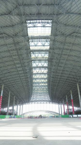 走近细看,平角飞檐的现代建筑犹如一个巨大的“曲面场”:从屋顶到侧翼,“凤凰”的双翅——南北对称的两个站场是曲面造型;“凤凰”的躯干,白色钢架弯成的“光谷”,从网壳到拱顶,也无一处不是曲面;内部结构中,从天花板到玻璃幕墙,还是曲面。