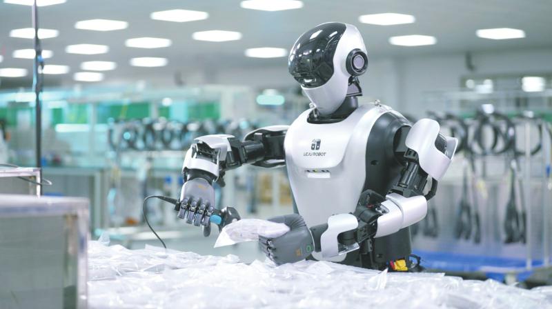 “绵阳造”乐聚夸父—MY机器人在亨通线缆车间参与物流搬运、扫码包装、沾锡工序等环节。乐聚机器人供图
